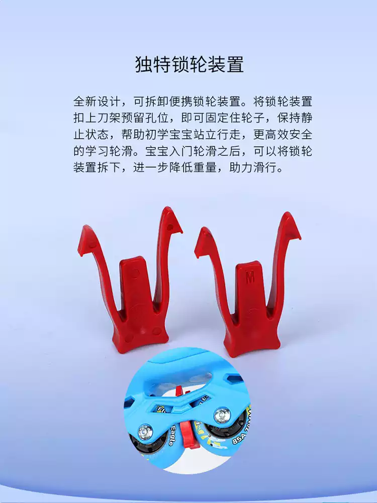جوراب این کفش اسکیت قابل شستشو، قابل تعویض و ضخیم برای راحتی پا و جلوگیری از ضربات به پا است. گردن اسکیت متحرک جهت سهولت برای انجام حرکات نمایشی و خم شدن راحتتر پاشه پای کودک شما طراحی شده است. همچنین، این کفش اسکیت دارای دو عدد بست (بست ریلی روی پاشنه و یک عدد بست چسبی) و بند نخی روی انگشتان پا است.